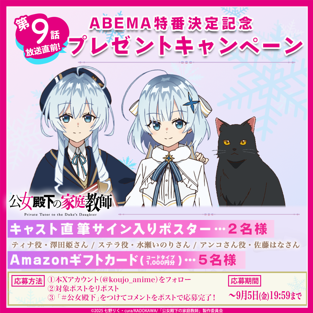 TVアニメ『公女殿下の家庭教師』「公女殿下の家庭教師」第9話直前!ABEMA特番決定を記念して、8月30日(土)より、TVアニメ『公女殿下の家庭教師』公式Xアカウント(@koujo_anime)にてキャンペーンを実施いたします。