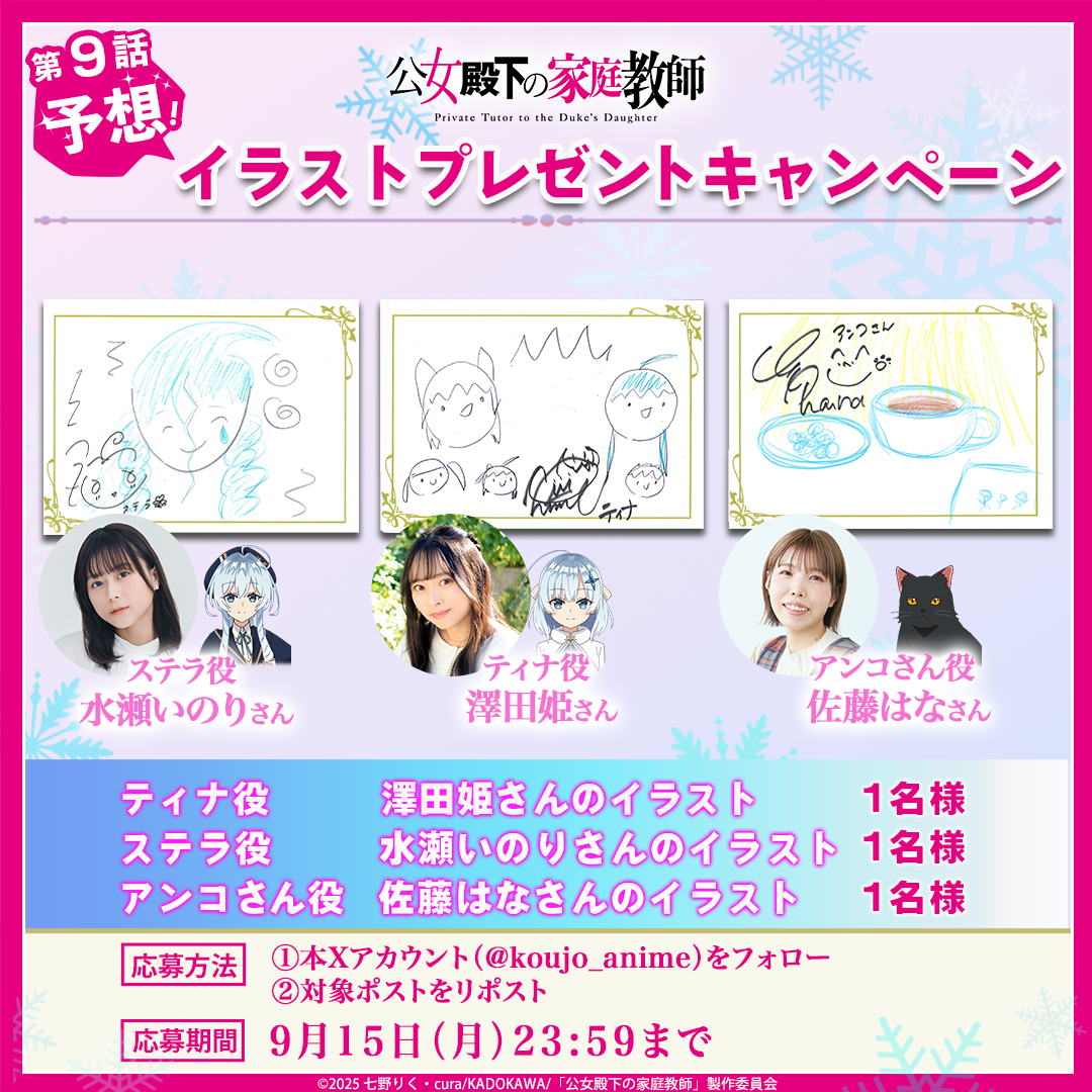 TVアニメ『公女殿下の家庭教師』第9話直前!ABEMA特番内企画にて描かれた、出演キャストの直筆サイン付きイラストのプレゼントキャンペーンを9月5日(金)より、TVアニメ『公女殿下の家庭教師』公式Xアカウント(@koujo_anime)にて実施いたします。