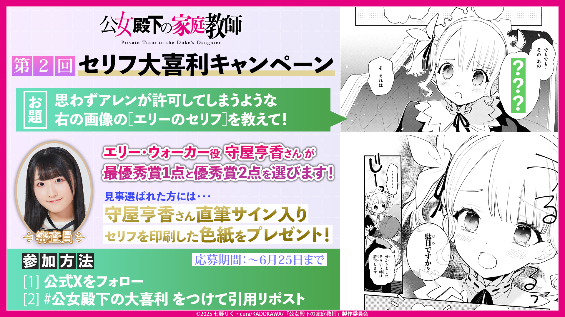 受賞者様には、各応募期間終了後3週間以内にTVアニメ『公女殿下の家庭教師』公式Xアカウント(@koujo_anime)よりダイレクトメッセージにて、景品発送のための入力フォームをお送りいたします。ダイレクトメッセージ内に記載された個人情報入力期限までに個人情報の入力をお願いいたします。
