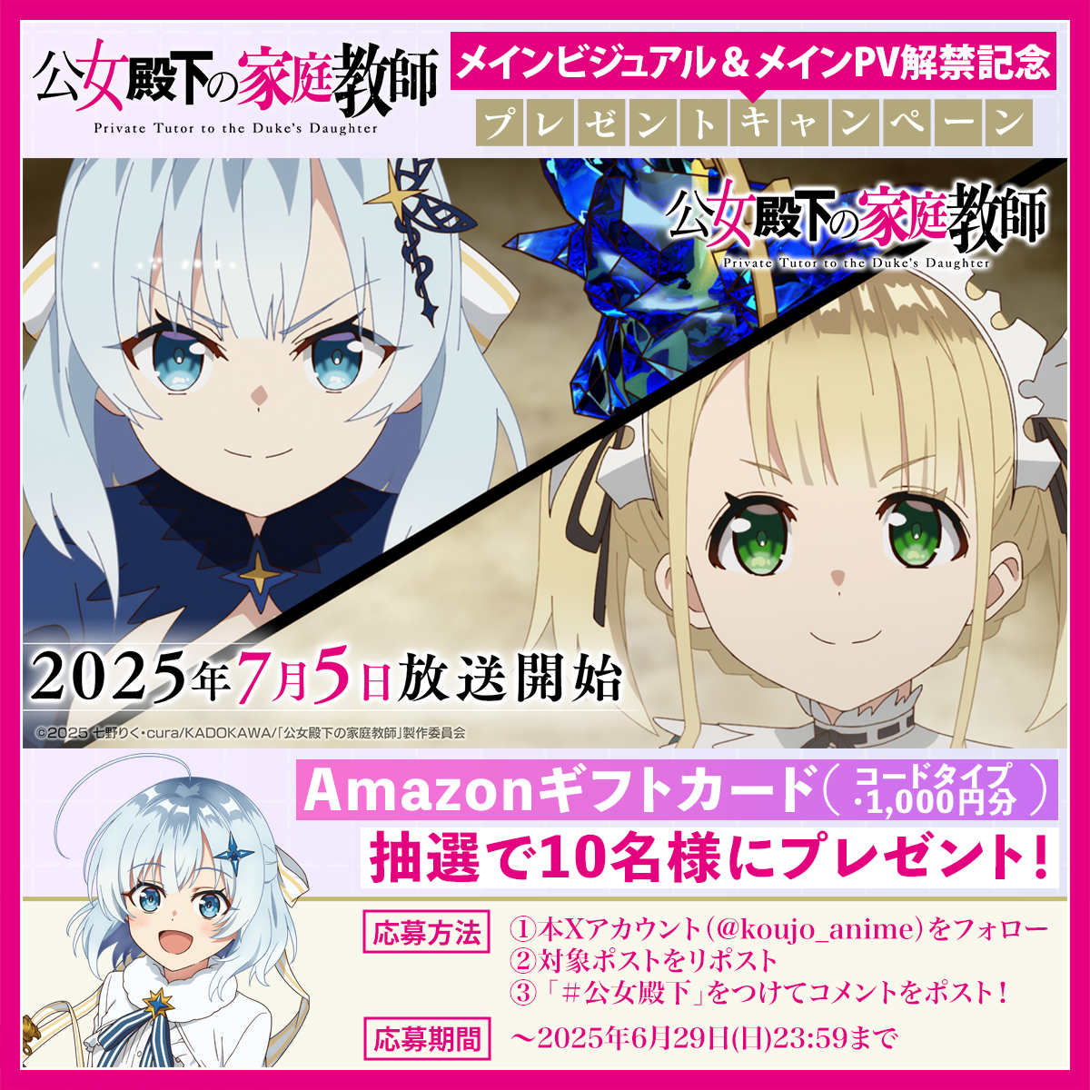 抽選の当選者様には、各応募期間終了後2週間以内にTVアニメ『公女殿下の家庭教師』公式Xアカウント(@koujo_anime)よりダイレクトメッセージでご連絡いたします。ダイレクトメッセージを受け取れる設定への変更をお願いいたします。